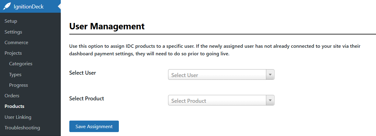 User Management - Select the user to be associated with the product, then select the product to assign to their account. Save the assignment.