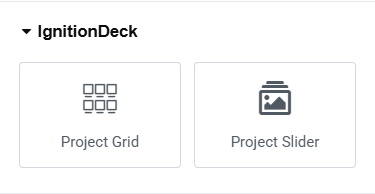 Open the Elementor editor and look for the IgnitionDeck category in the widget panel on the left side. You can also search for "Project Grid" or "Project Slider" in the search bar.