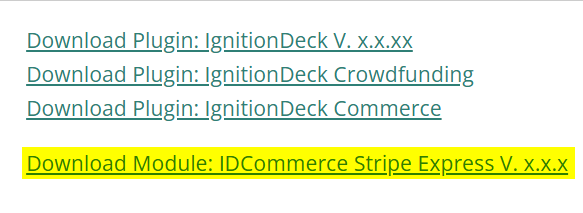 Download the Stripe Express module (idcommerce-stripe-express.zip) from the IgnitionDeck Members dashboard.