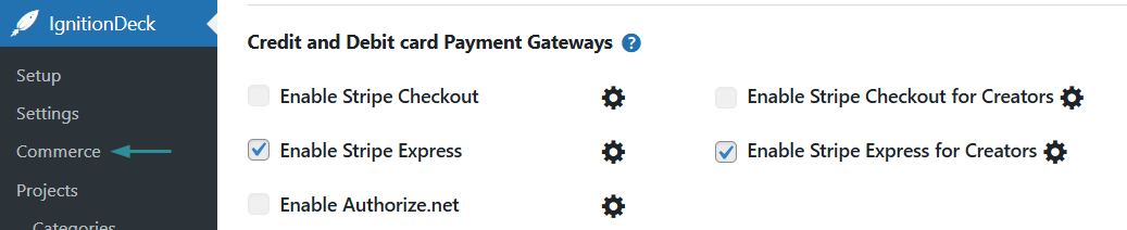 - To use Stripe Express, ensure that the site is set to use IDCommerce as the commerce platform under the IgnitionDeck » Setup » Upgrade tab.