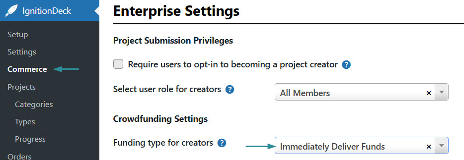 Under Commerce » General » Enterprise Settings, select the "Immediately Deliver Funds" option under Funding type for creators *.